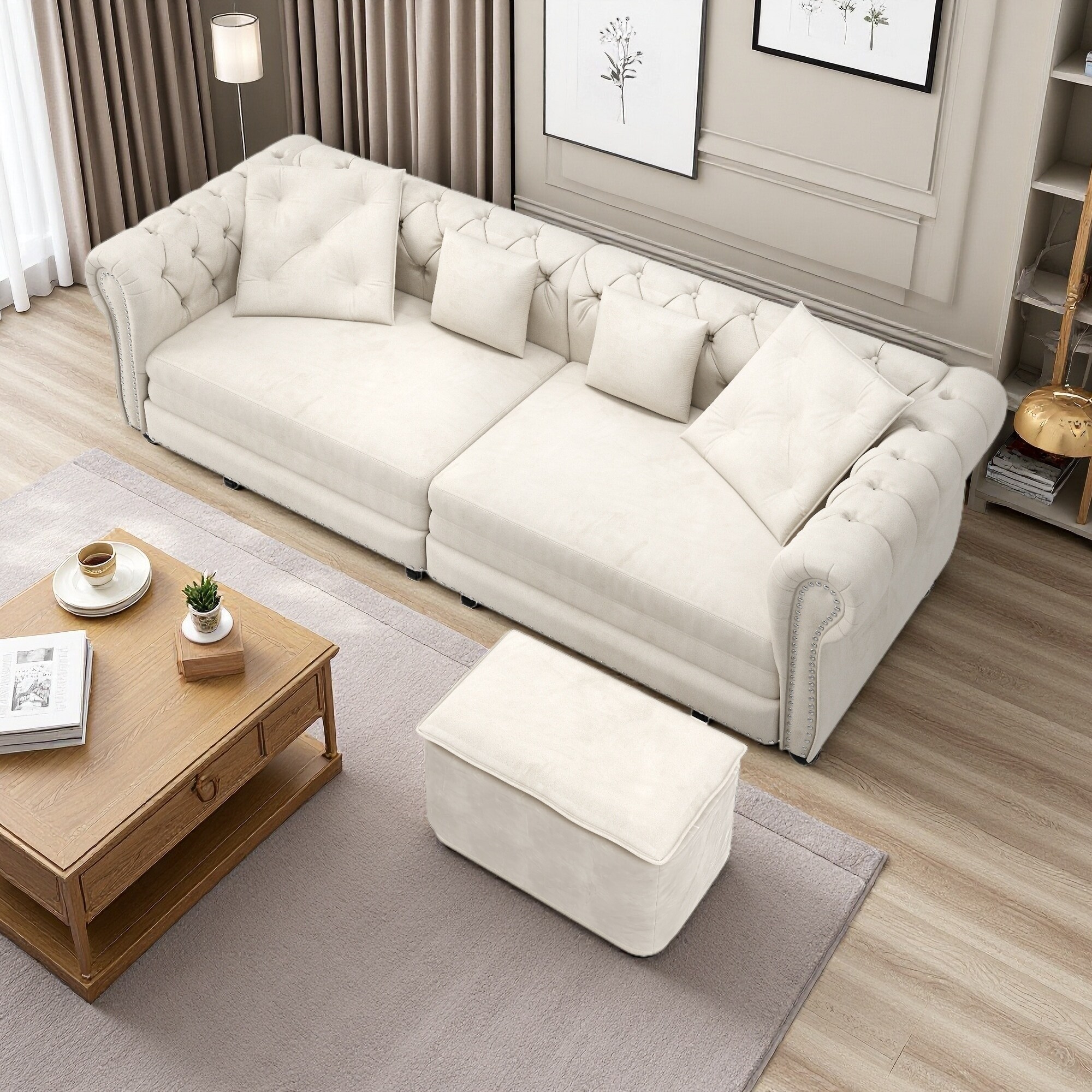 89" Velvet 3-in-1 Chesterfield Sectional Sofa with Pull-Out Bed & Movable Ottoman