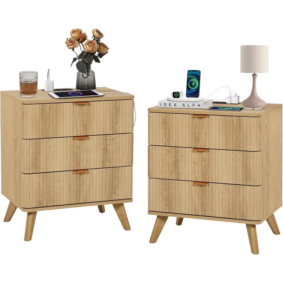 Mid-Century Modern Nightstand with Charging Station, 3 Drawers, and Fluted Design