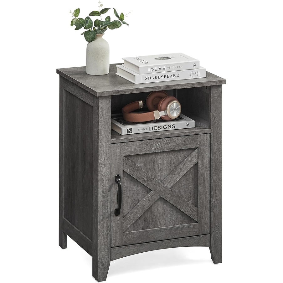 Farmhouse Nightstand with Barn Door, Storage Bedside Table, Misty Gray