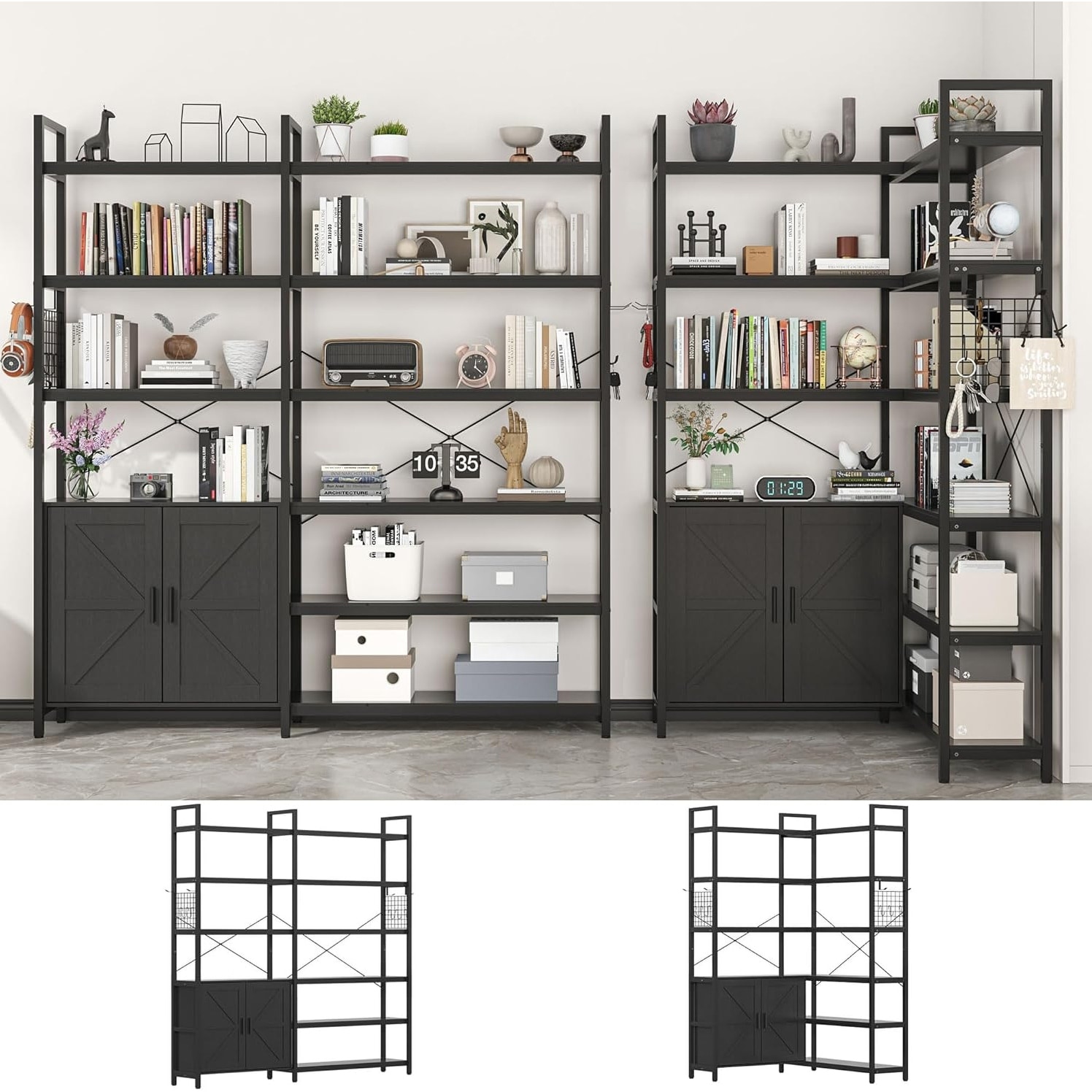 6-Tier Farmhouse Black Corner Book Shelf with 2 Barn Doors and 10 Storage Shelves, 71.3 Inch Tall