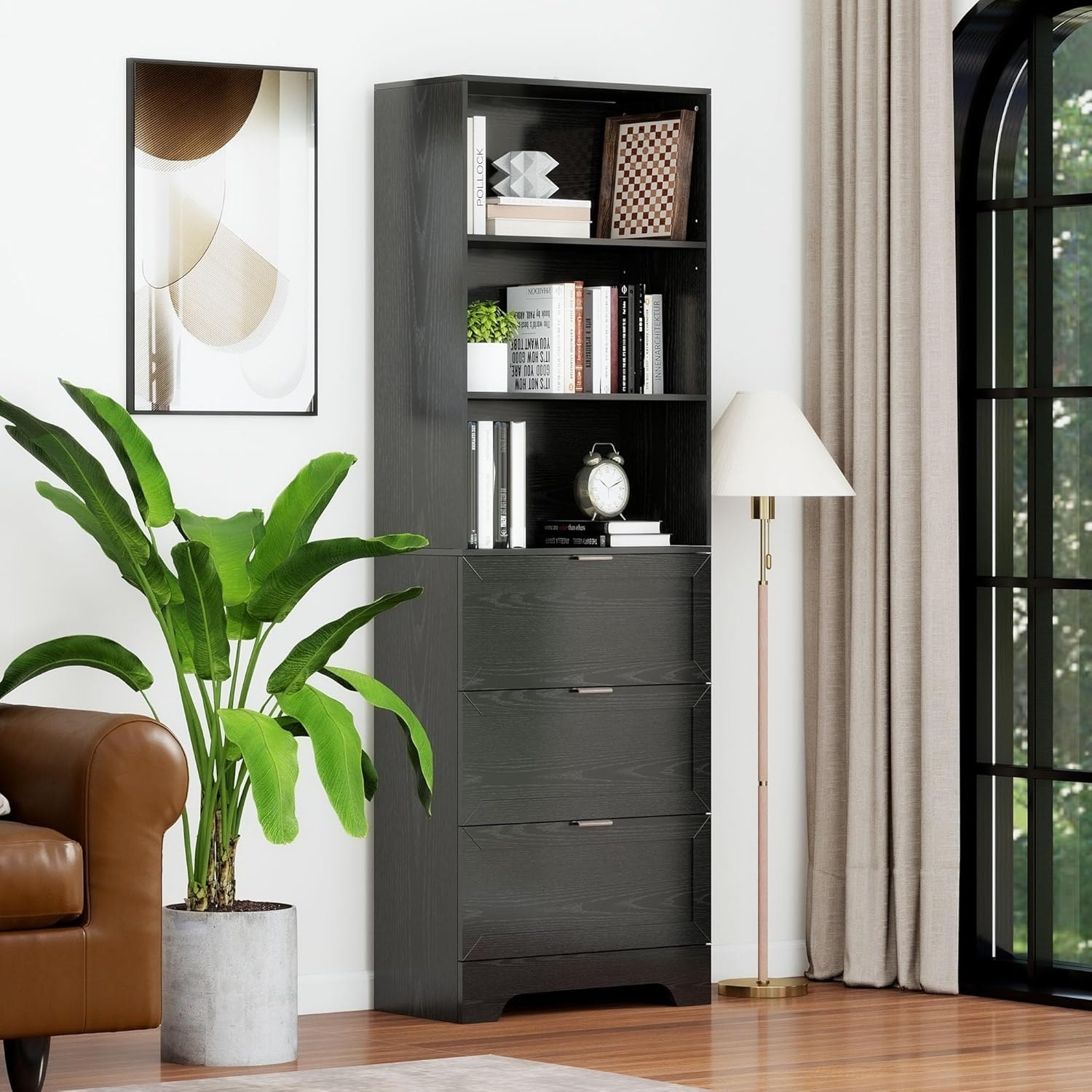 6-Tier Industrial Wood Bookcase with Drawers, Modern Black Bookshelf for Living Room and Office