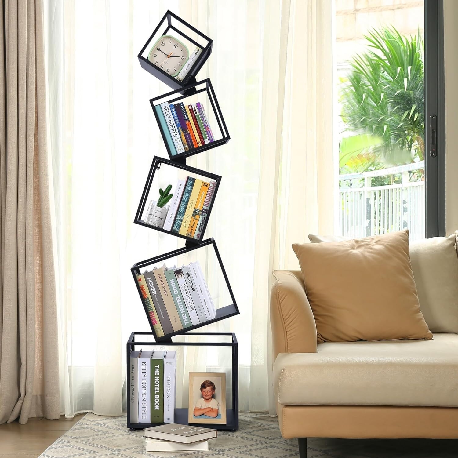 Modern 5-Tier Geometric Metal Bookshelf for Living Room, Bedroom, Office - Black