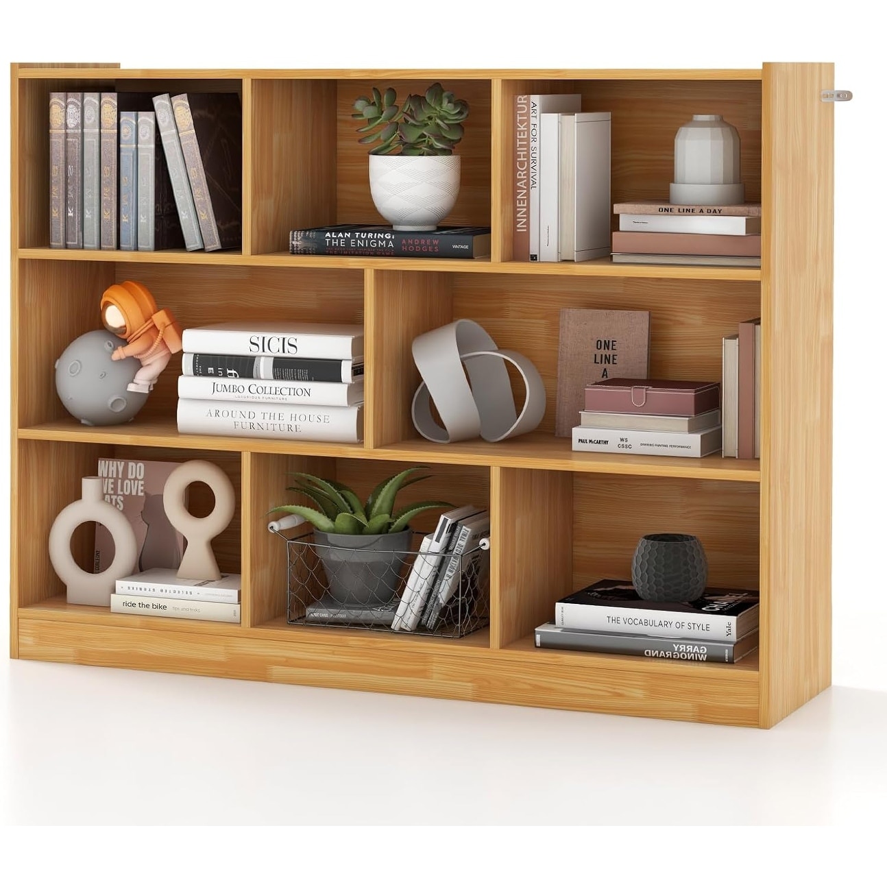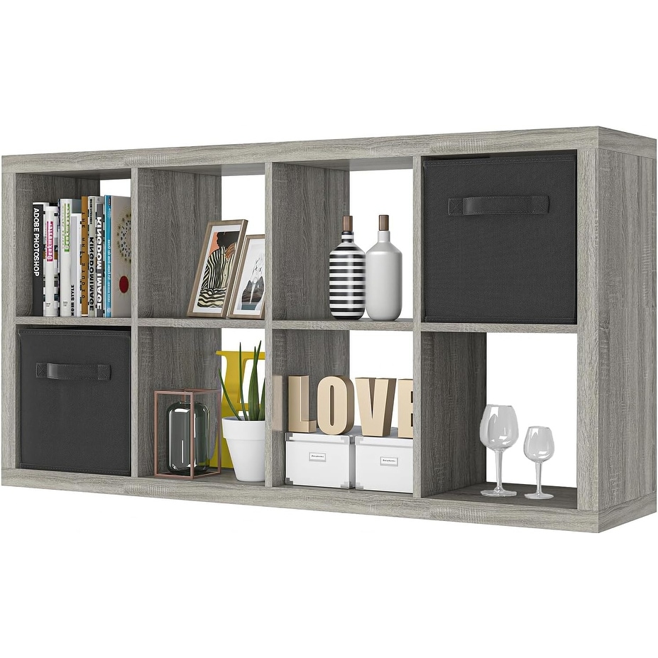 8-Cube Storage Organizer with Bins, Modern Wood Bookcase for Living Room, Bedroom, Office, Gray Oak