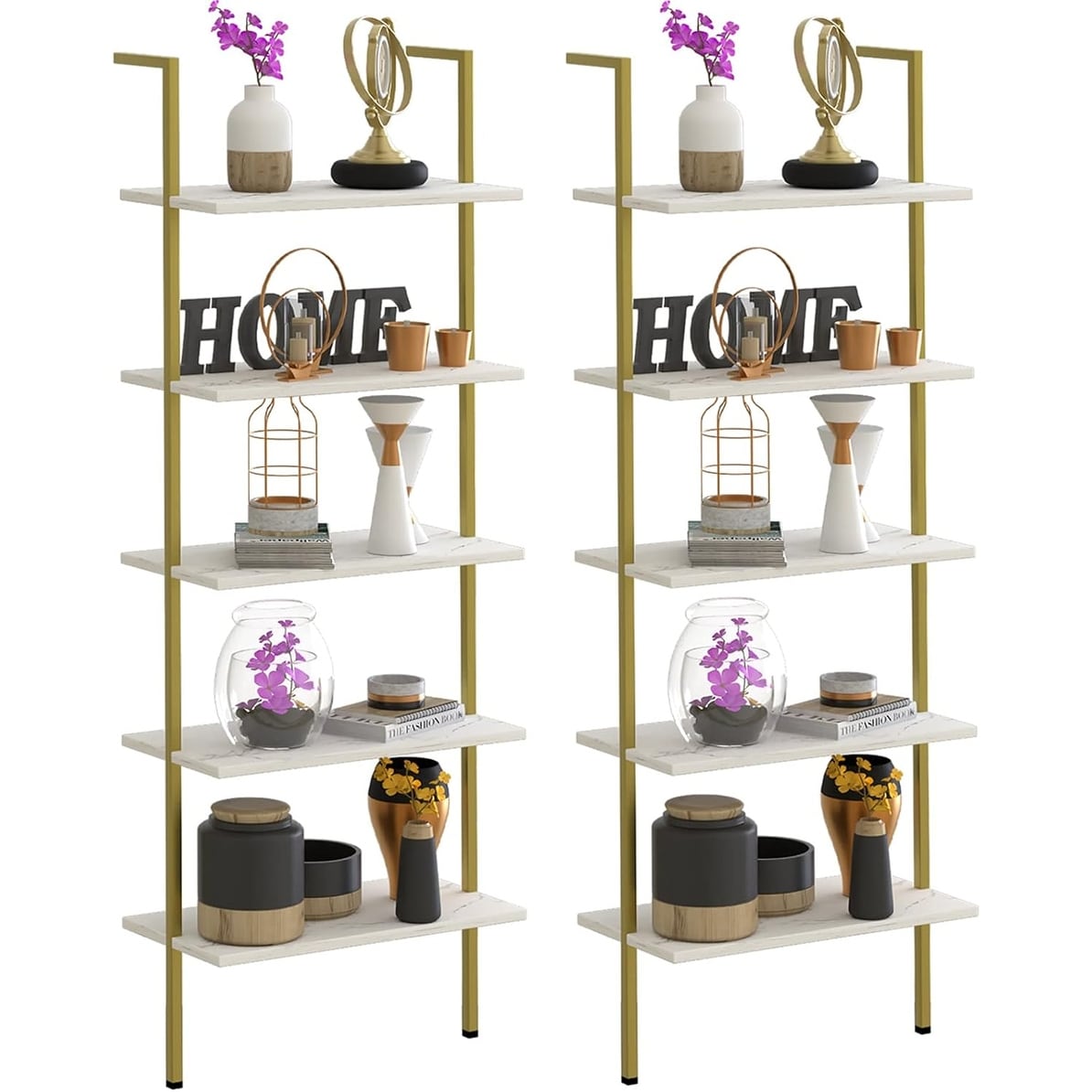 Modern 5-Tier Ladder Shelf Wall-Mounted Industrial Bookcase with White Marble Finish