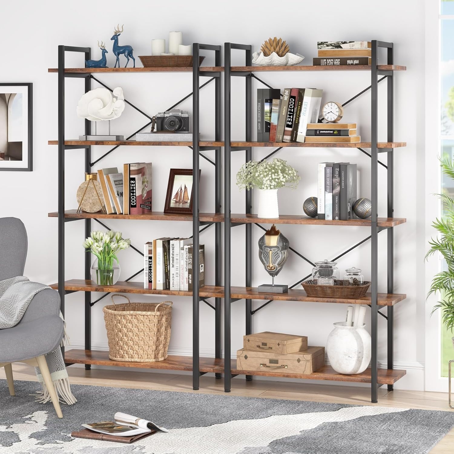 Industrial Rustic 5-Tier Bookshelf Set of 2, Metal Frame Open Shelf Bookcase for Living Room, Office, Study