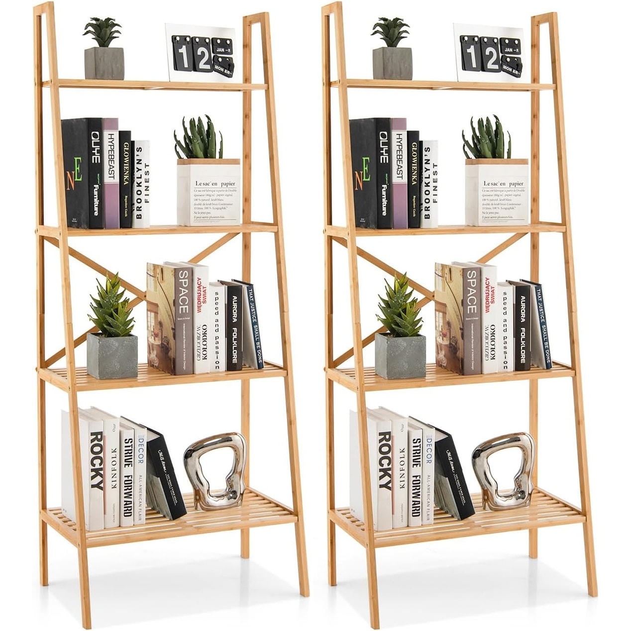 4-Tier Bamboo Bookshelf Set, Free Standing Plant Stand with Anti-Tipping Device, Corner Ladder Shelf for Small Spaces, Natural