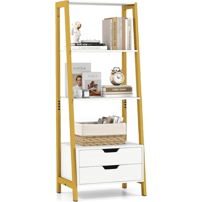 4-Tier Ladder Shelf with 2 Drawers, 52.5 inch Tall Freestanding Bookcase, White+Gold