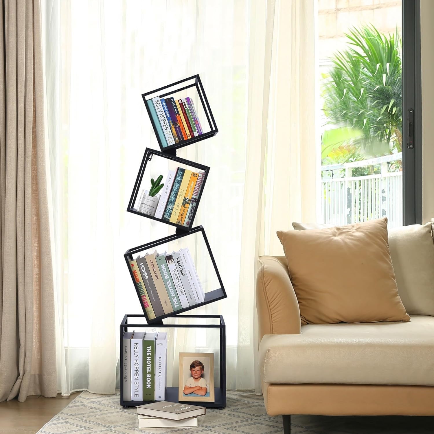 Modern 4-Tier Geometric Black Bookcase, 49 inch Tall Corner Shelf for Books, CDs, and Home Decor