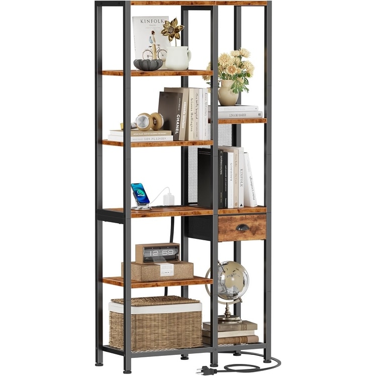 6-Tier Industrial Bookshelf with USB Charging Ports, Power Outlets & Fabric Drawer for Home Office