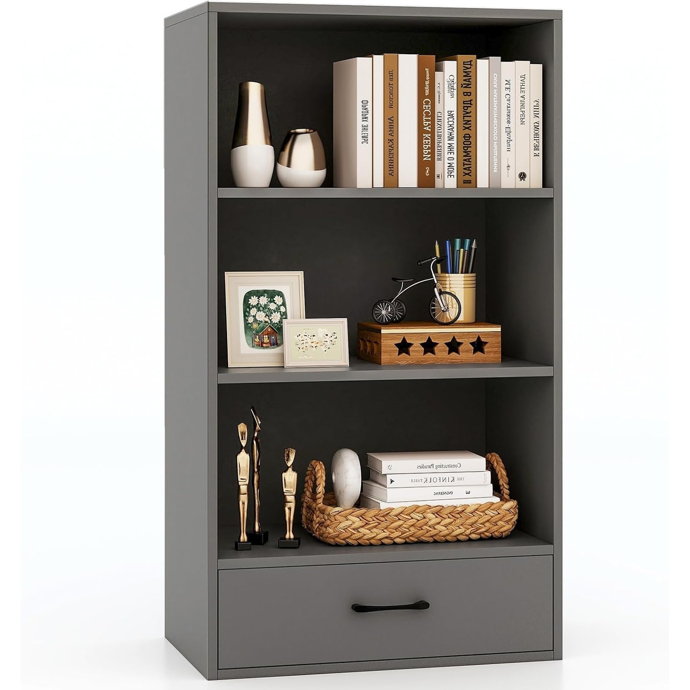 3-Tier Wooden Bookcase with Drawer, Compact Storage Shelf for Bedroom, Living Room, or Home Office, Gray, 42.5''H