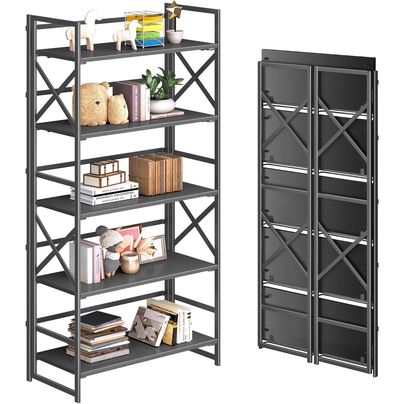 5-Tier Foldable Bookcase with X Metal Frame, Easy Assembly, Anti-Toppling Design, Space-Saving Storage Organizer