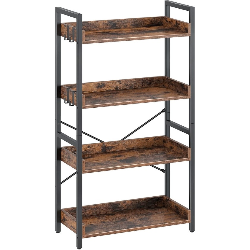 4-Tier Industrial Wood Bookcase with Metal Frame & Hooks, Vintage Storage Shelf for Living Room, Bedroom - Rustic Brown
