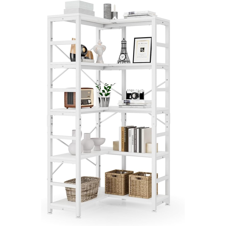 Modern 5-Tier Corner Bookshelf, Large Open Shelf Bookcase for Living Room, Bedroom, and Office, White