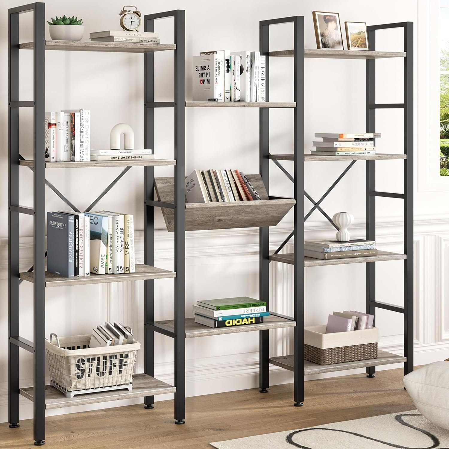 Triple Wide 4-Tier Bookshelf with 11 Open Shelves, V-Shaped Shelves, and Storage Drawer, Grey
