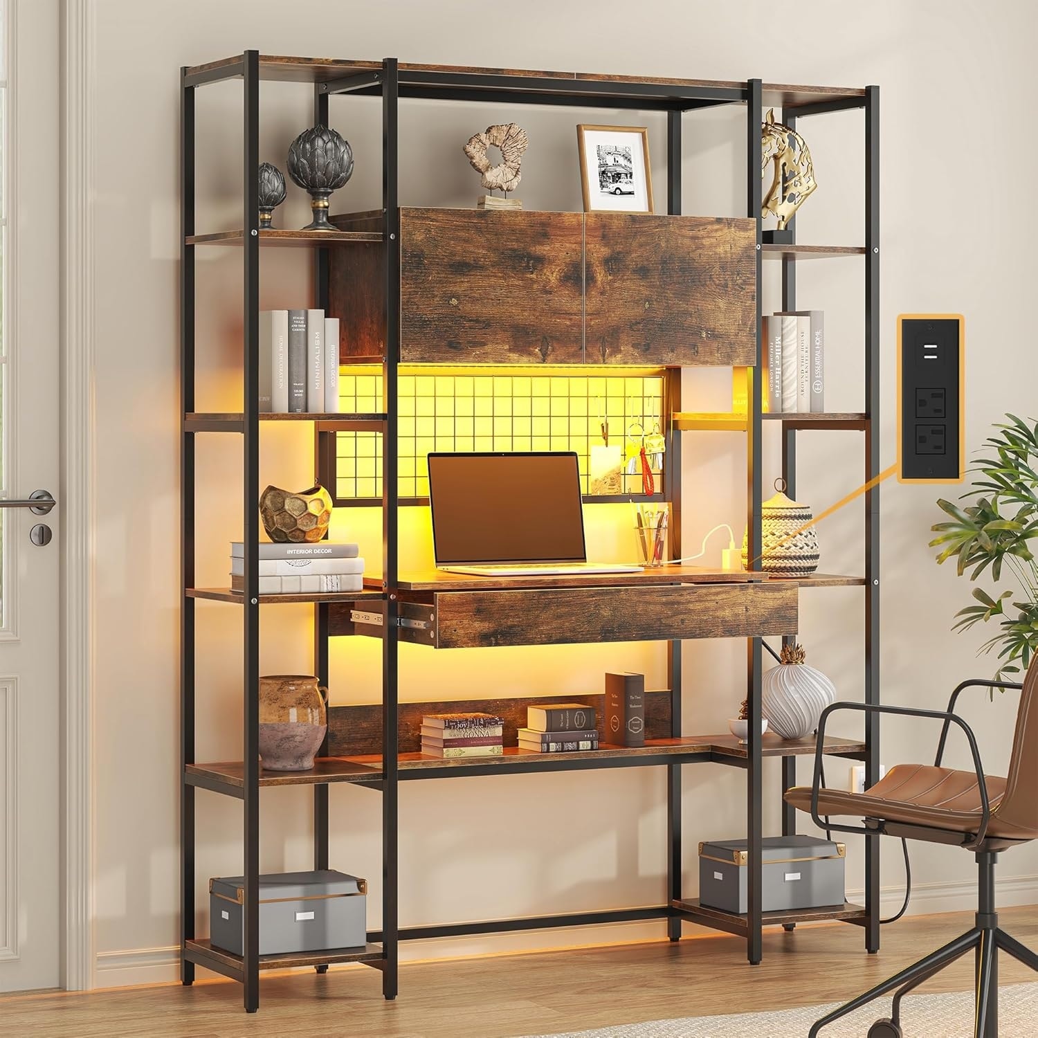 5 Tier Rustic Bookshelf with Desk, RGB Lights, Drawer, and 12 Storage Shelves