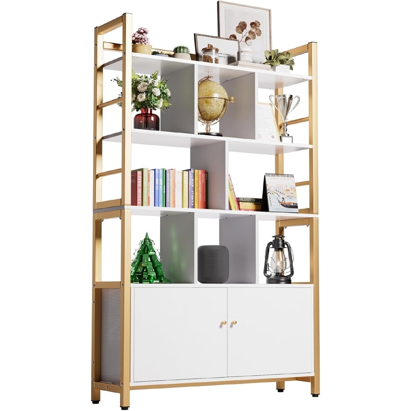4-Tier Heavy Duty Wood & Metal Bookshelf with Cabinet Storage, White & Gold, 64.2in H x 39.4in W x 11.8in D