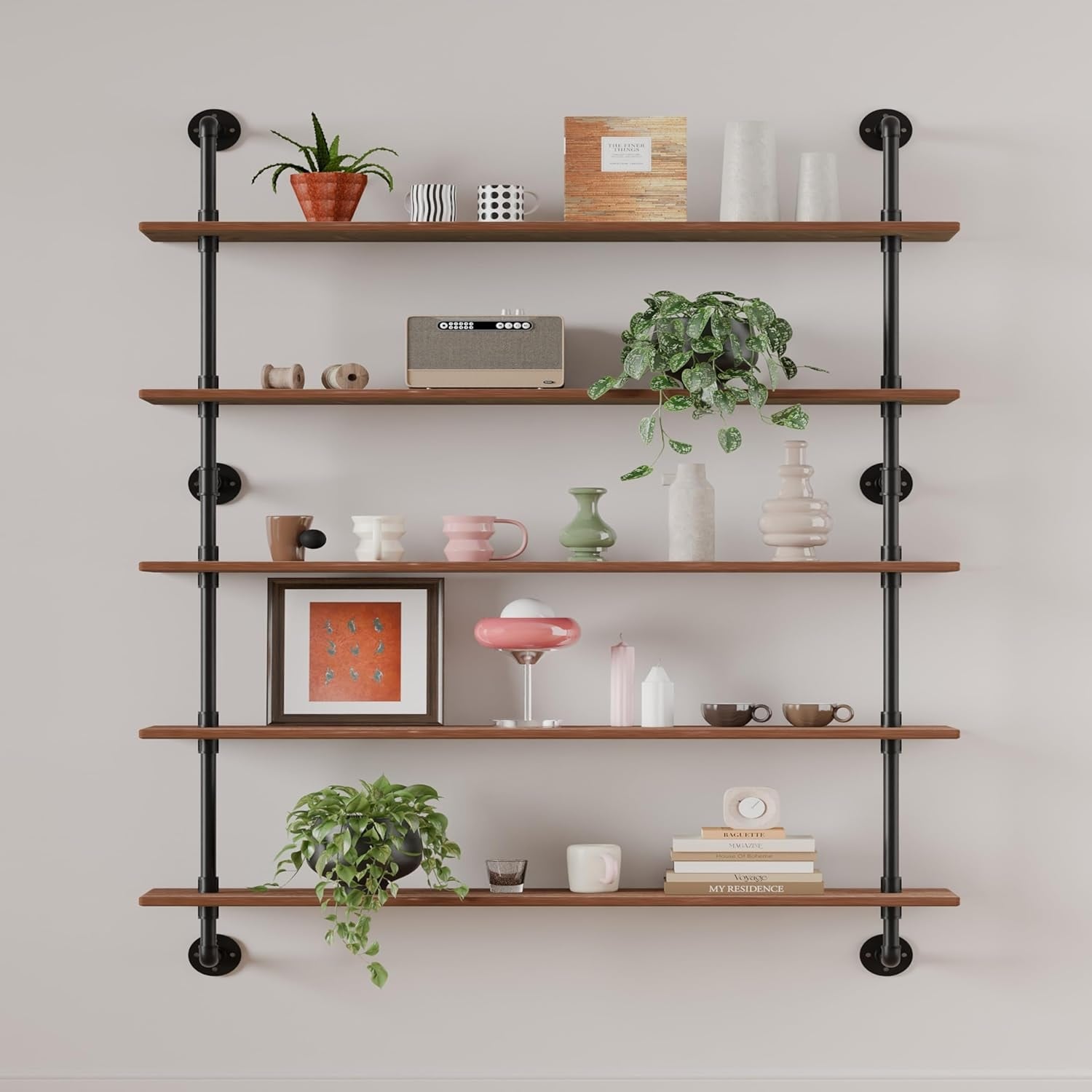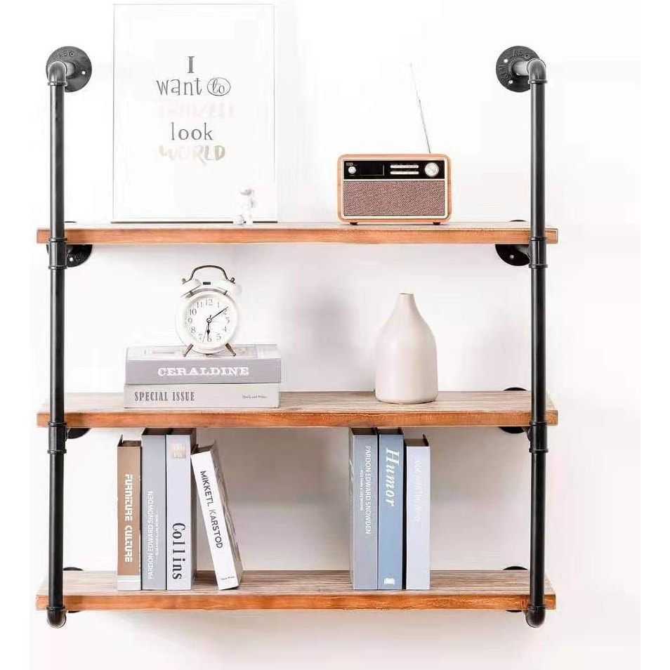 Wall Mounted Pipe Shelving, Rustic Metal Floating Shelves, Wood Bookcases, DIY Hanging Shelves, Home Storage (4-Tier, 36in)