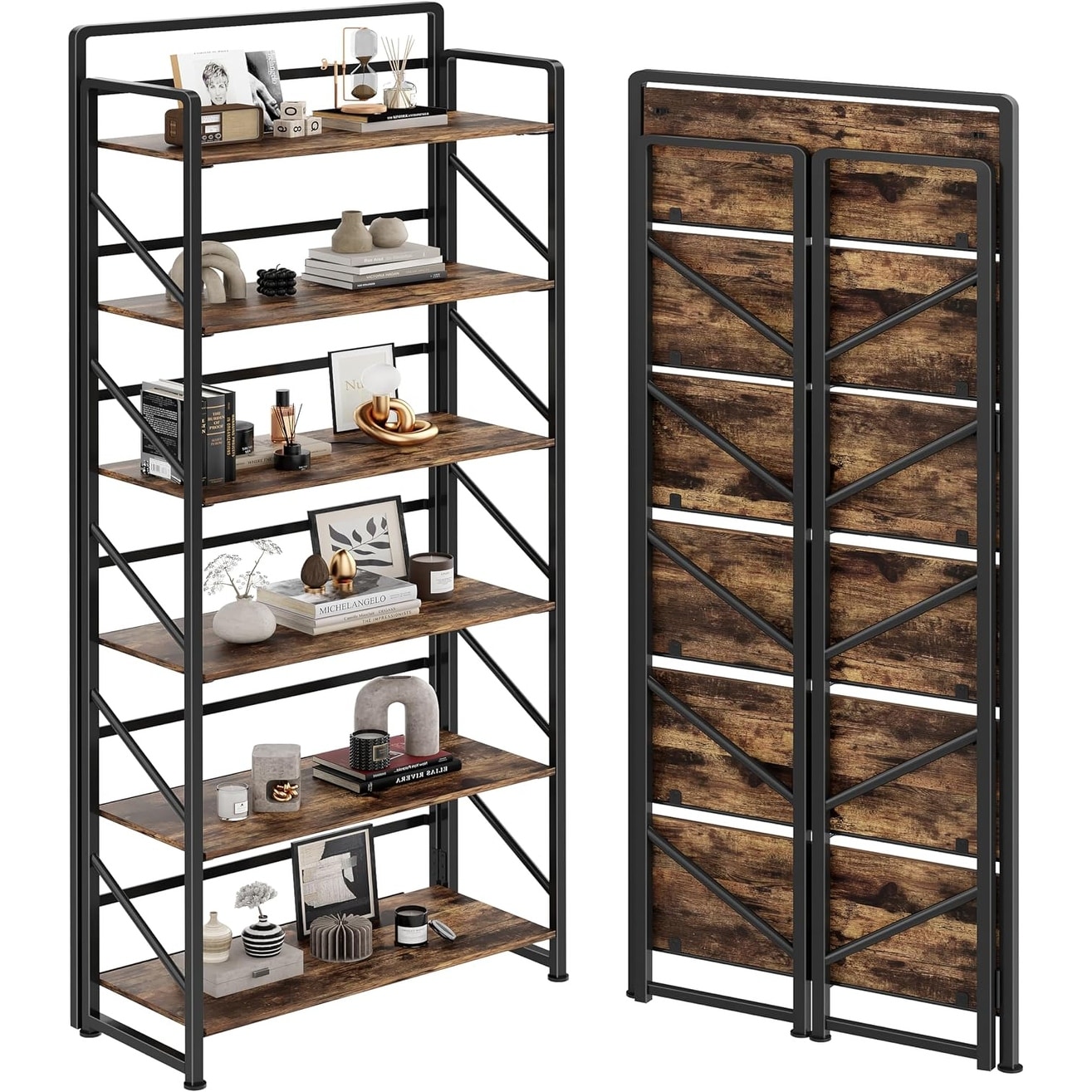 6-Tier Foldable Metal Bookshelf, Industrial Vintage Wood Bookcase for Living Room, Bedroom, Office Storage