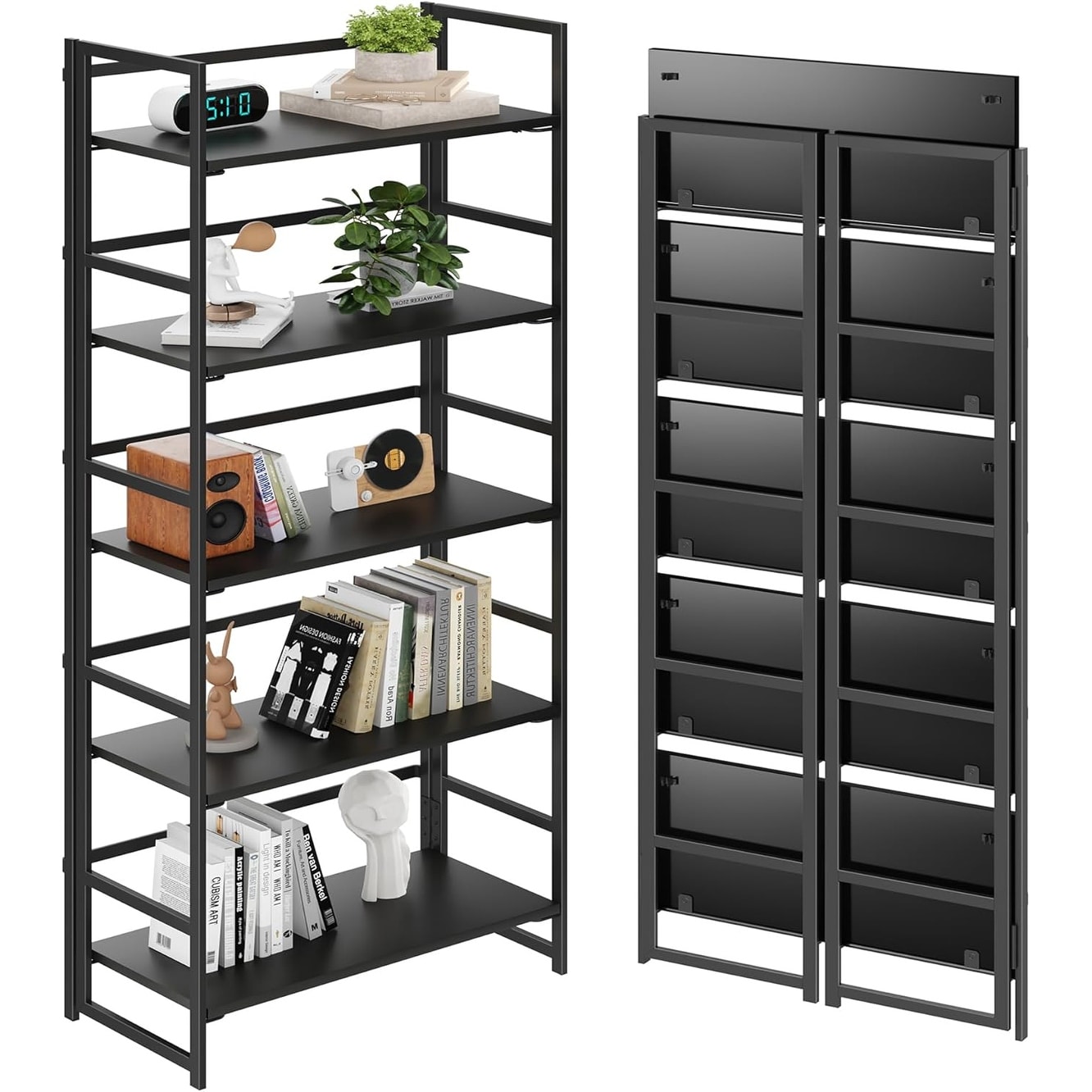 Vintage Multifunctional Folding Bookshelf, No-Assembly Plant Stand Storage Rack Shelves for Home Office (All Black, 5-Tier)