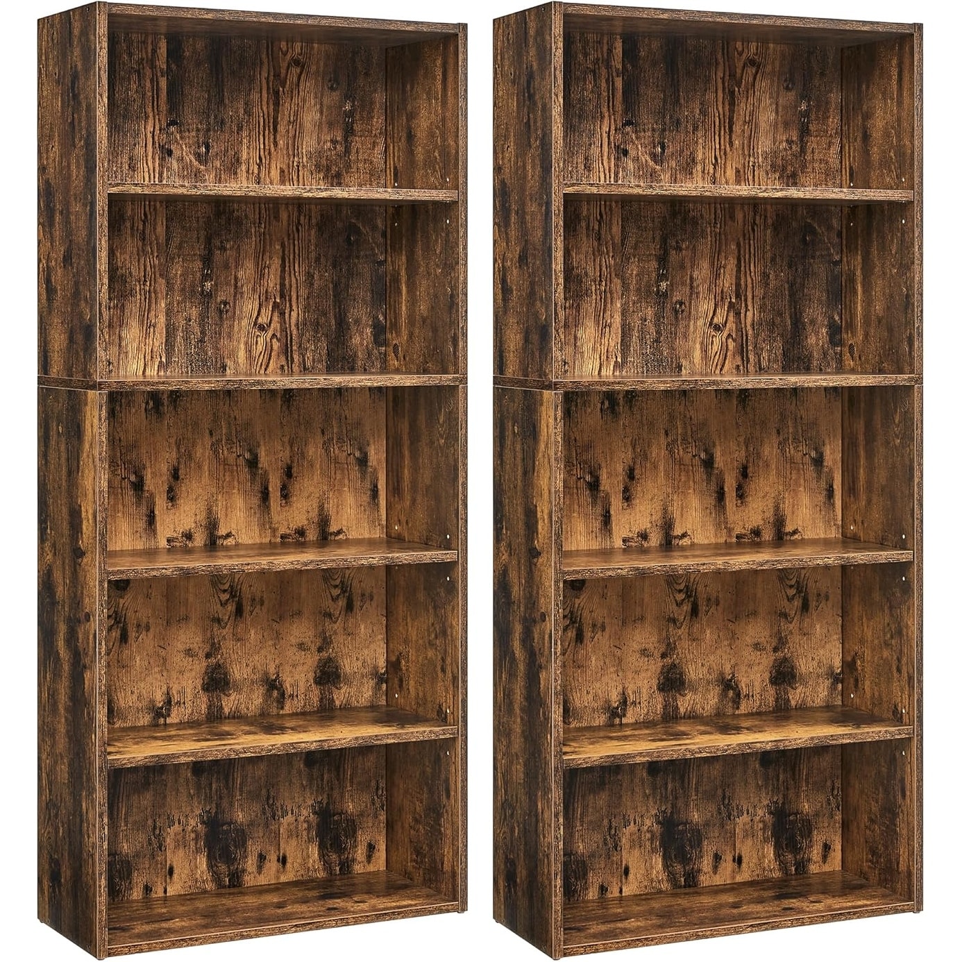 Set of 2 Adjustable 5-Tier Open Bookcases, 23.6 Inches Wide, Rustic Brown, Easy to Assemble
