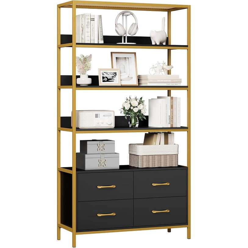 5-Tier Tall Bookcase with Drawers, Black and Gold Industrial Storage Shelf for Living Room and Office