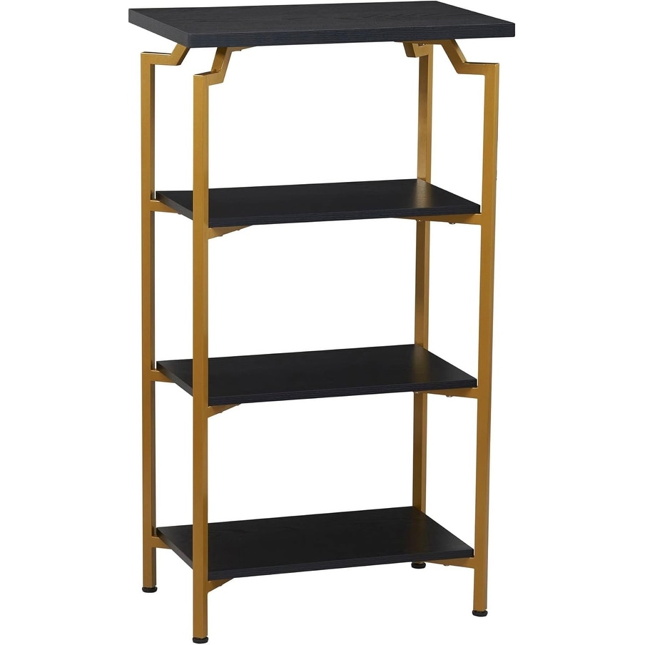 Narrow 4 Shelf Open Storage Bookshelf in Black Oak Wood Grain with Gold Metal Legs