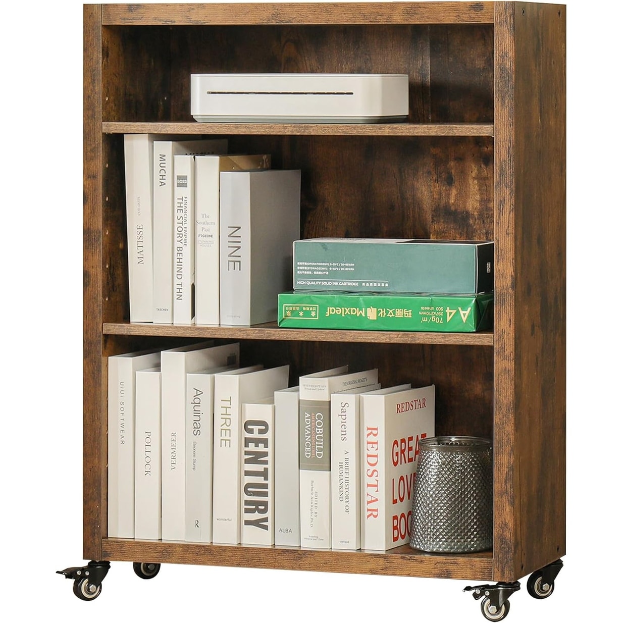 3-Tier Movable Bookshelf with Adjustable Shelves and Wheels for Living Room, Bedroom, or Office
