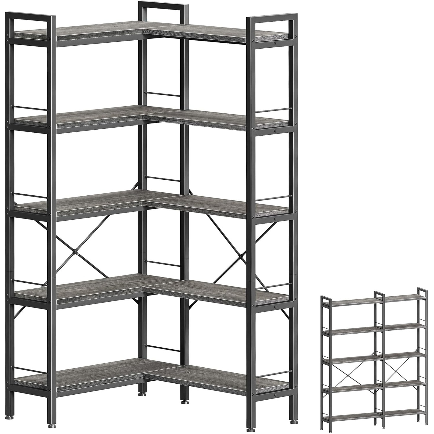 L-Shaped Corner Bookshelf with 10 Open Shelves, 49.4 Inch Wide Bookcase with Metal Frame & Wooden Board, Adjustable Feet, Grey