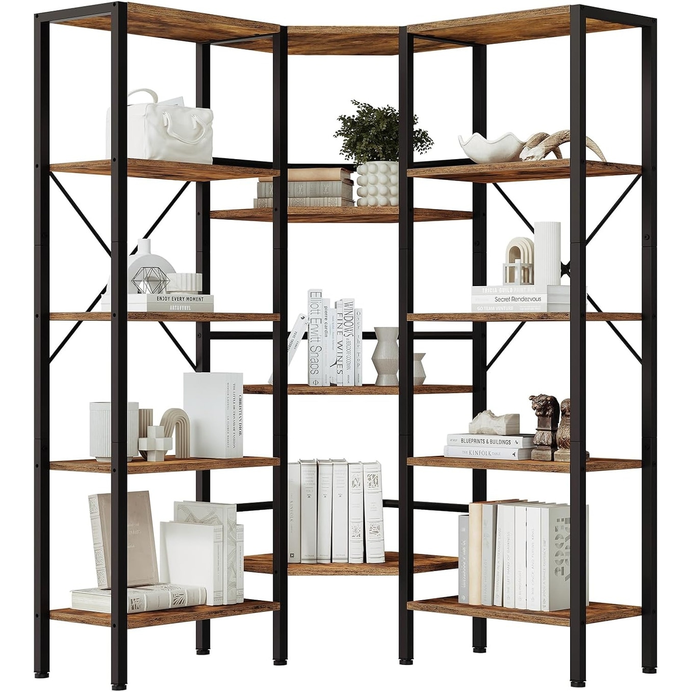 12-Tier L Shaped Corner Bookshelf, Double Wide Wall Mount Bookcase with Metal Frame and Wood (Brown)
