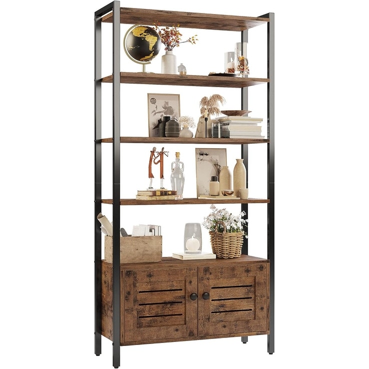 76 Inch Multi-Tier Storage Shelf with Cabinet Doors, Rustic Brown Bookcase for Home Office & Living Room