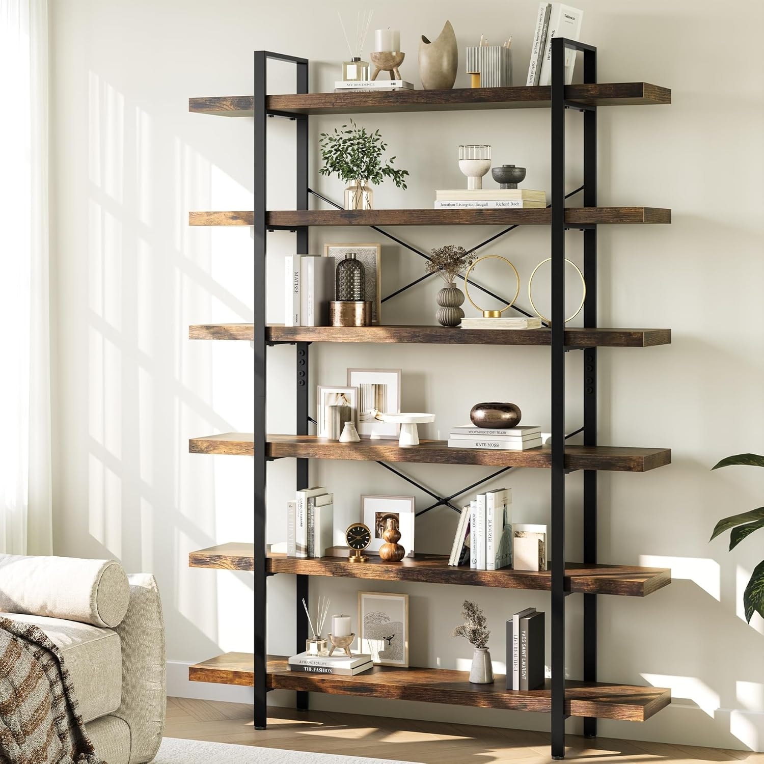 6-Tier Industrial Bookcase, 47 Inch Wide Wood Shelf, 120lbs Capacity, Rustic Open Shelving for Home Office, Living Room, Bedroom