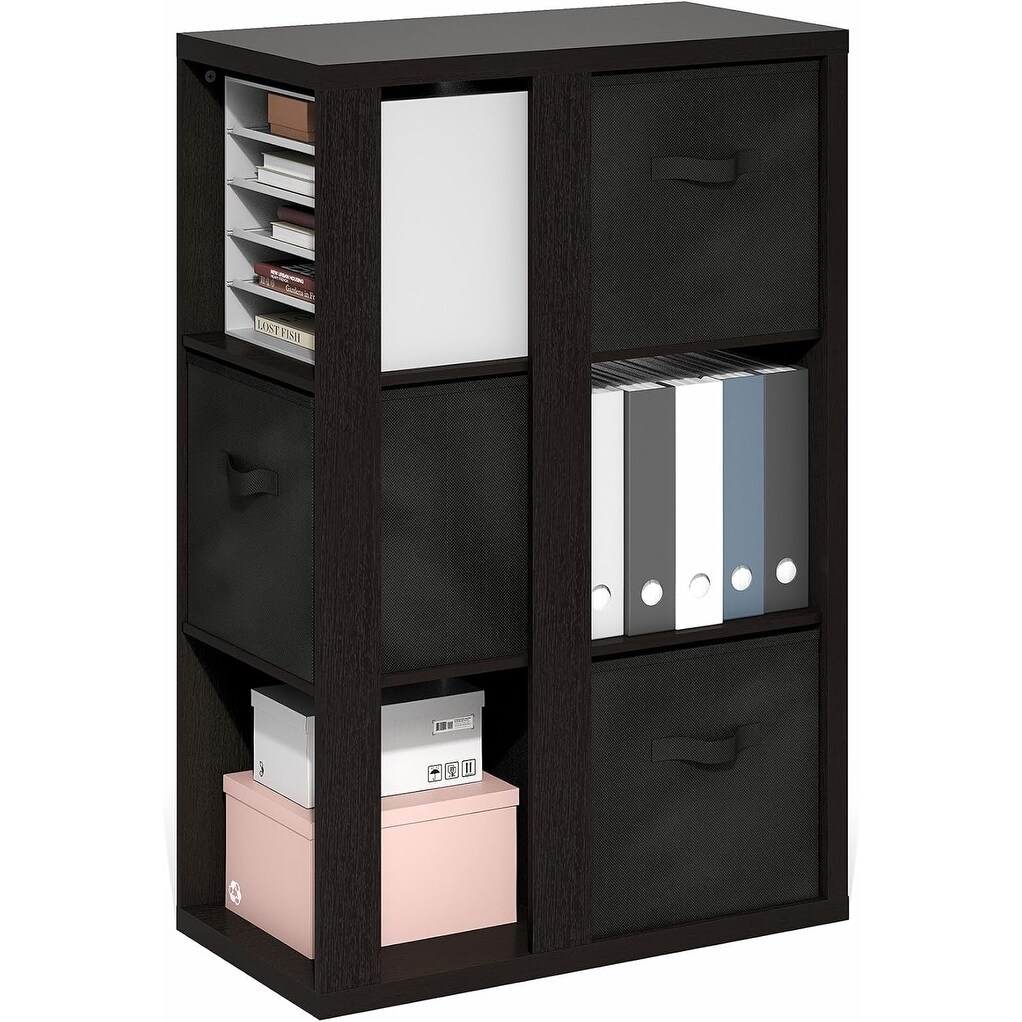 3-Tier Open Shelf Bookcase with Storage Bins, Dark Oak/Black, 13.6 x 29.3 x 43.8 inches
