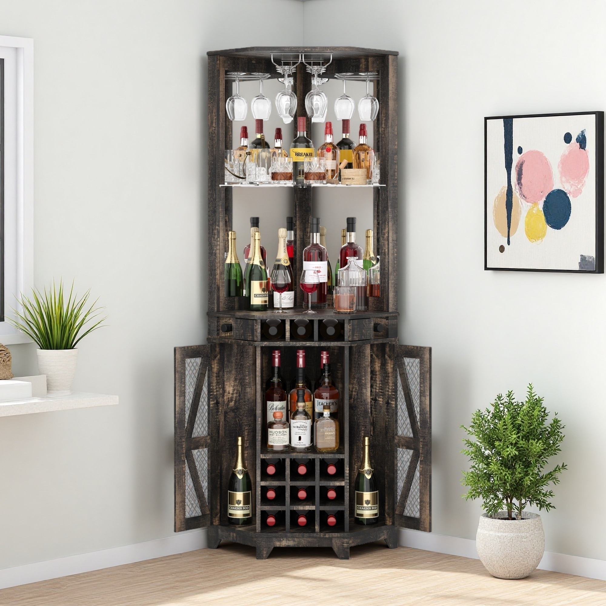 72" Corner Bar Cabinet with Barn Door & Wine Storage