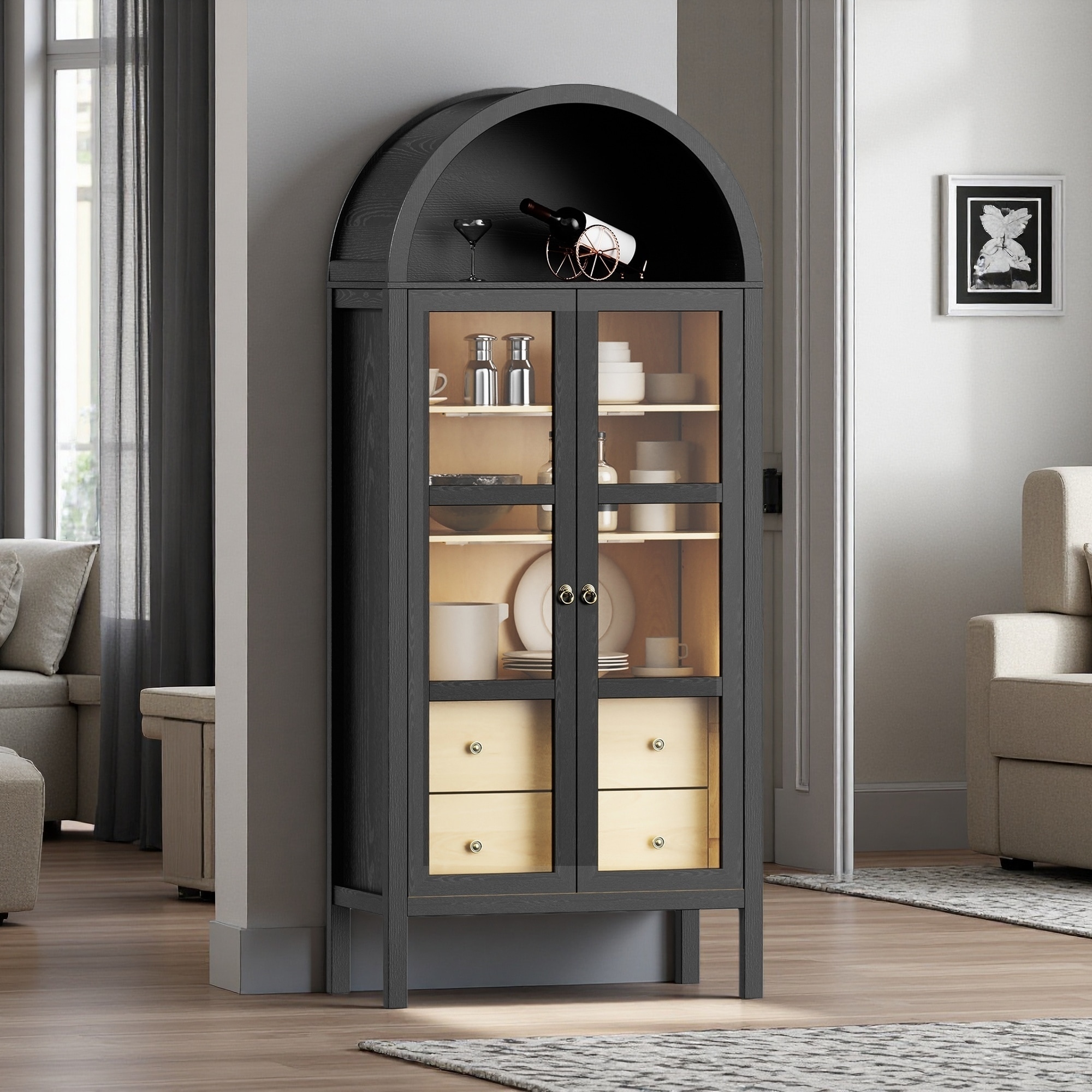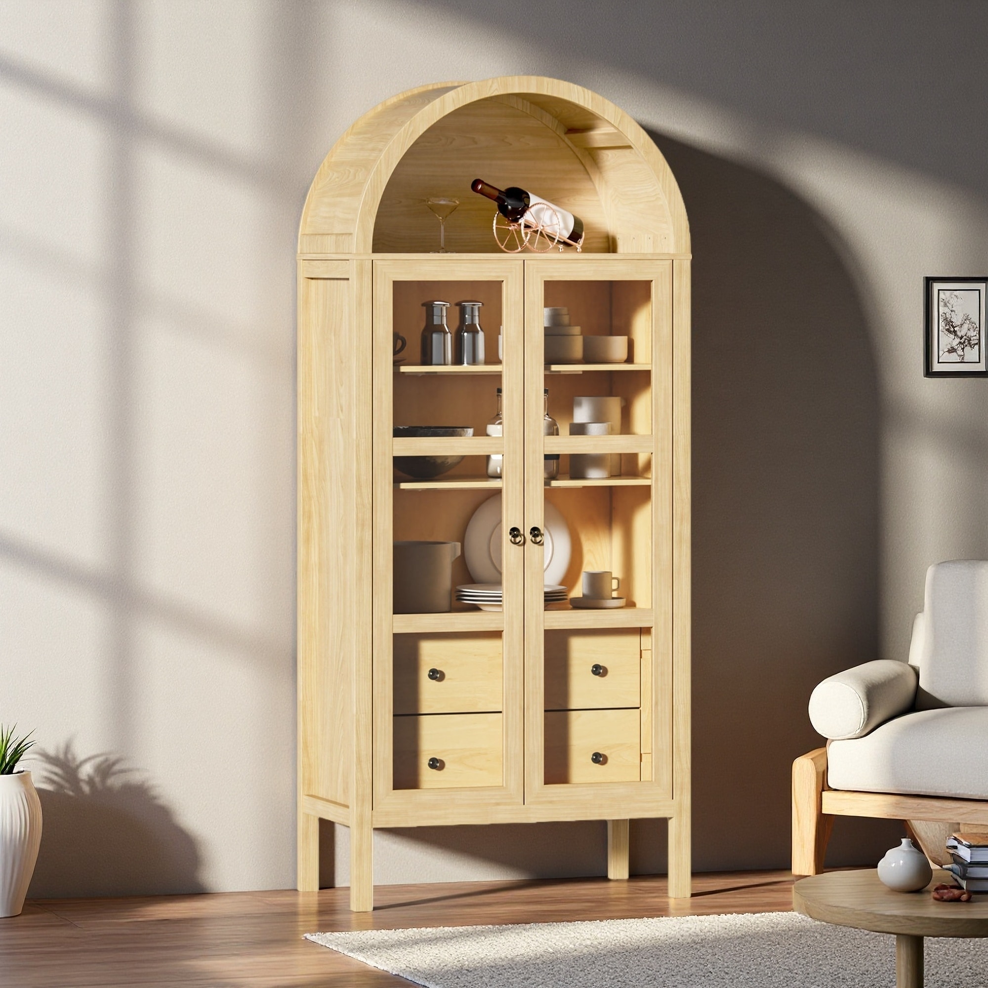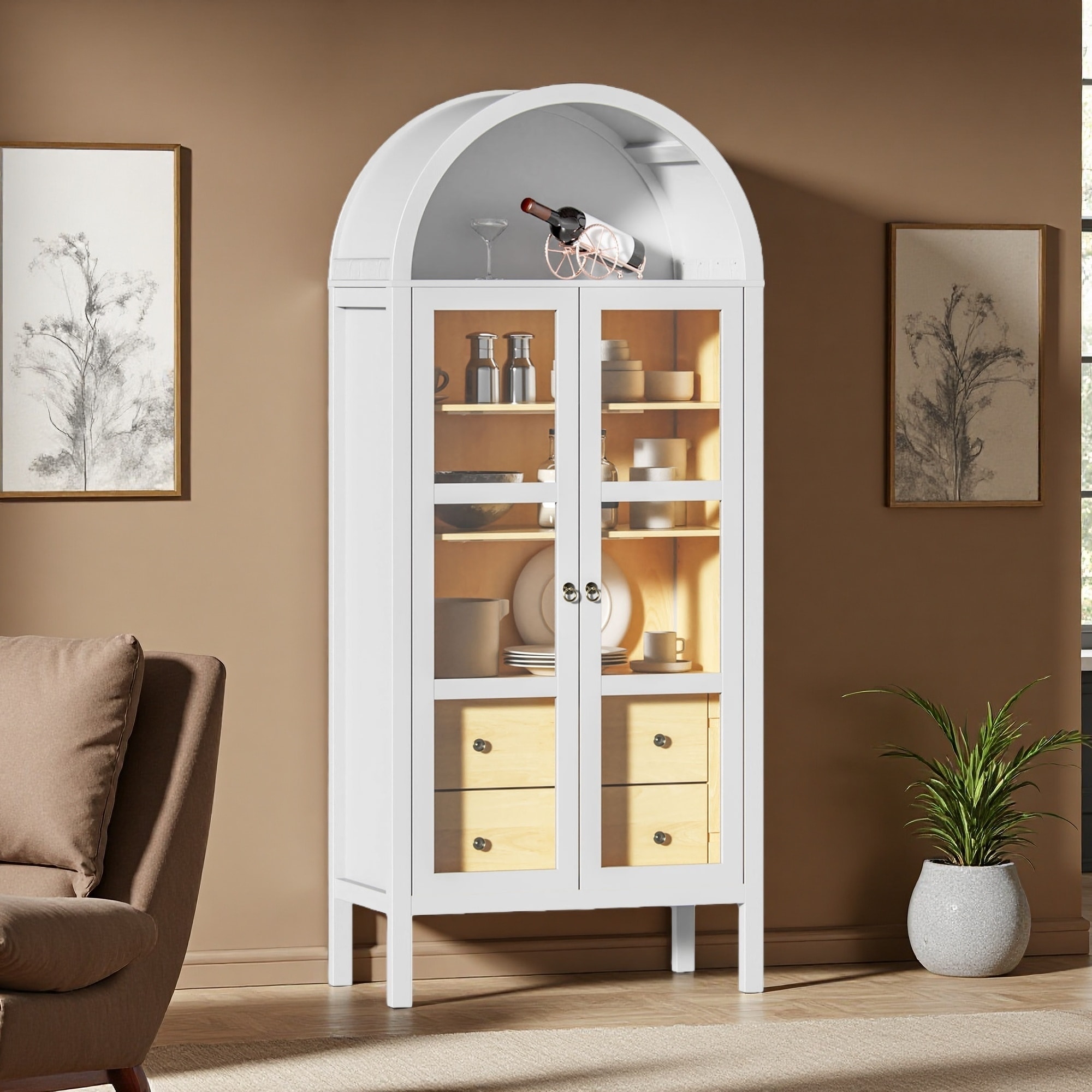 72" Modern Arched Glass Door Cabinet with Adjustable Shelves