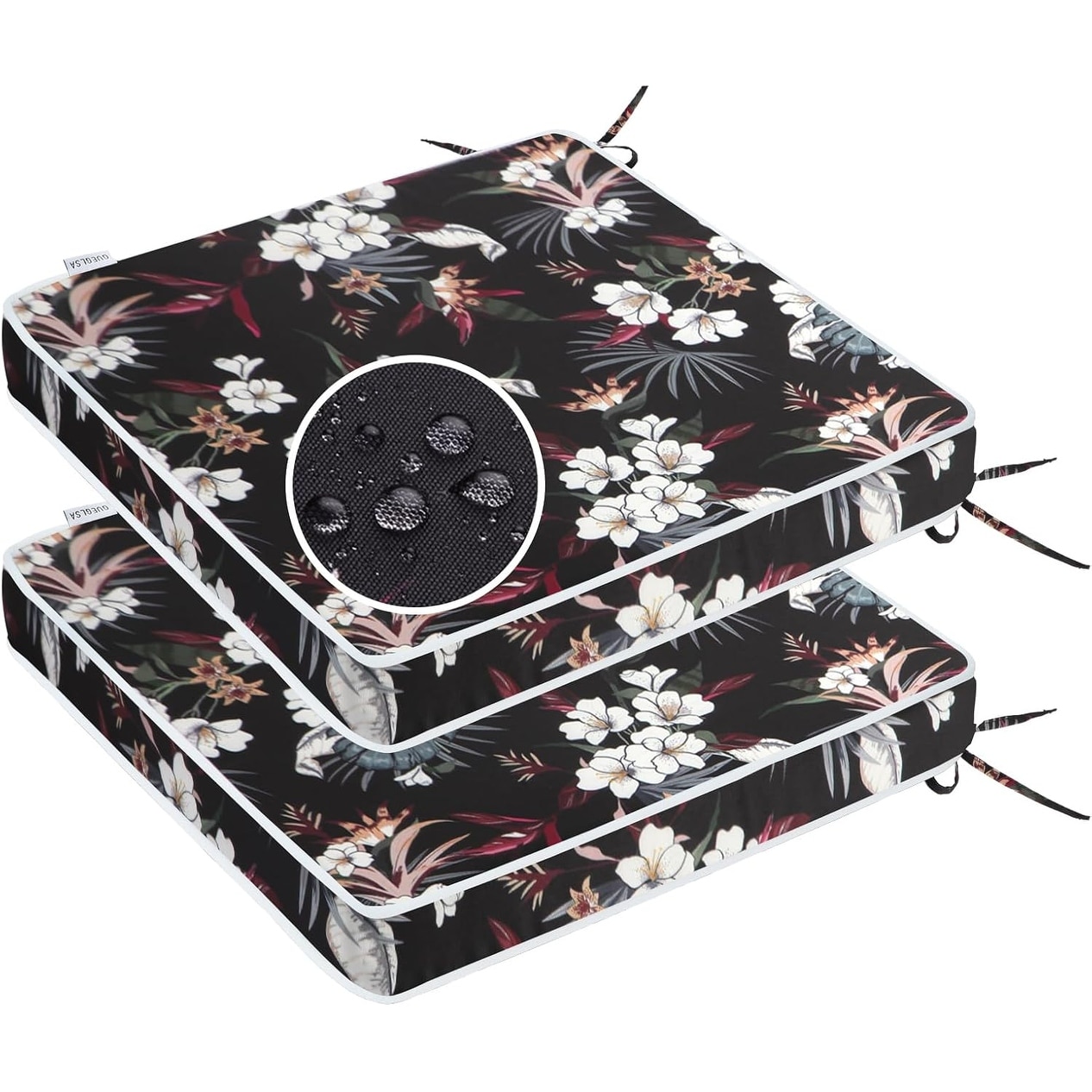Waterproof 18x18 Inch Square Patio Seat Cushions with Ties, Set of 2, White Flower Design