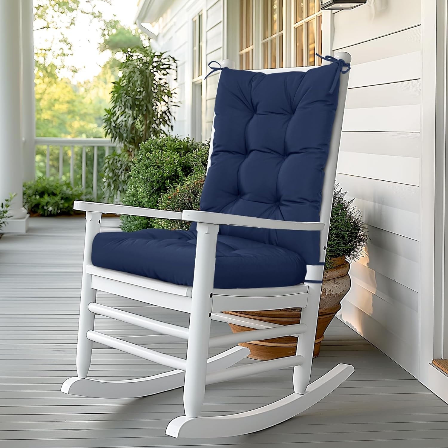 Non-Slip Tufted Rocking Chair Cushion with Straps, Waterproof, High Back, Indoor/Outdoor Use, Blue