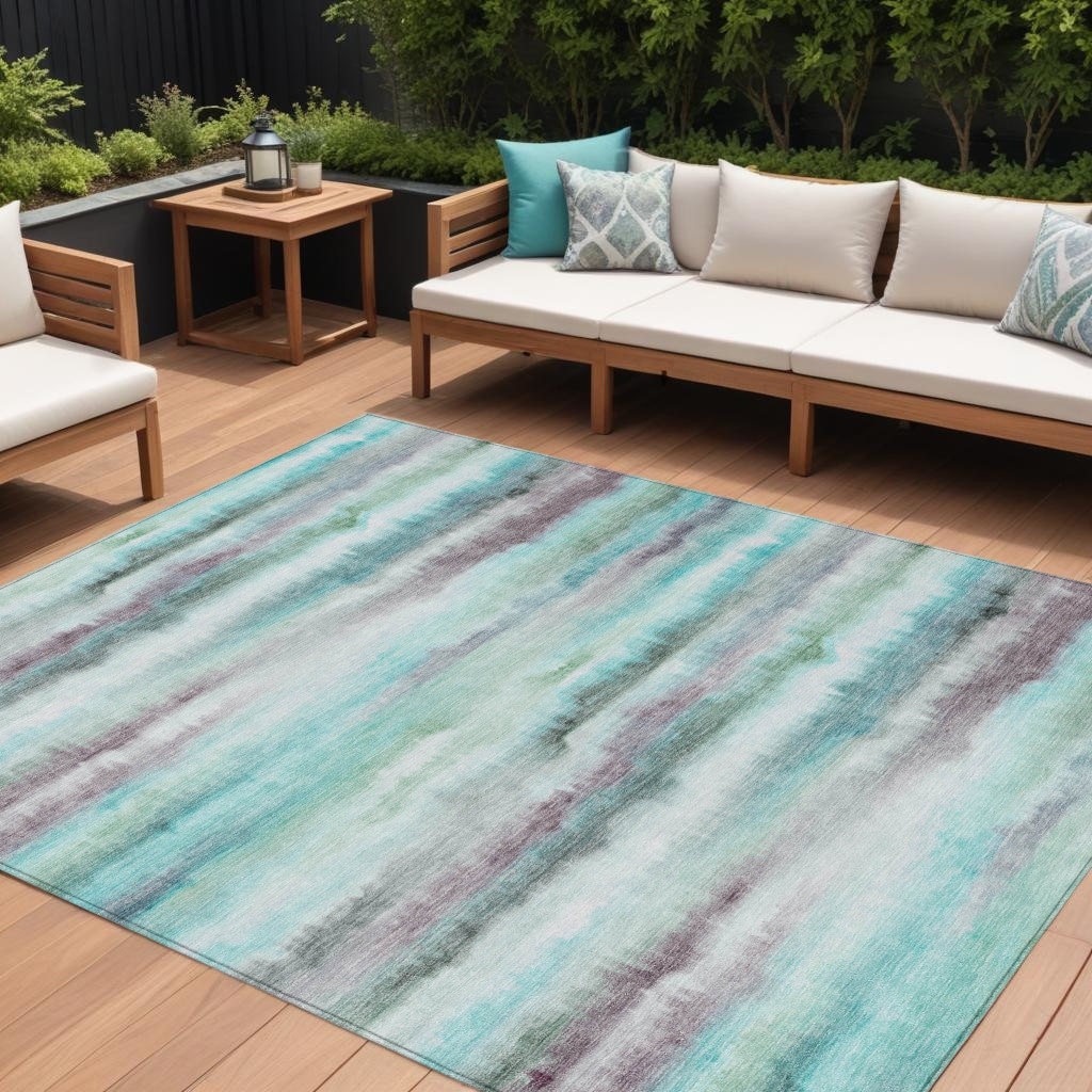 10' X 14' Teal Blue Plum And Ivory Striped Washable Indoor Outdoor Area Rug - 9' x 12'