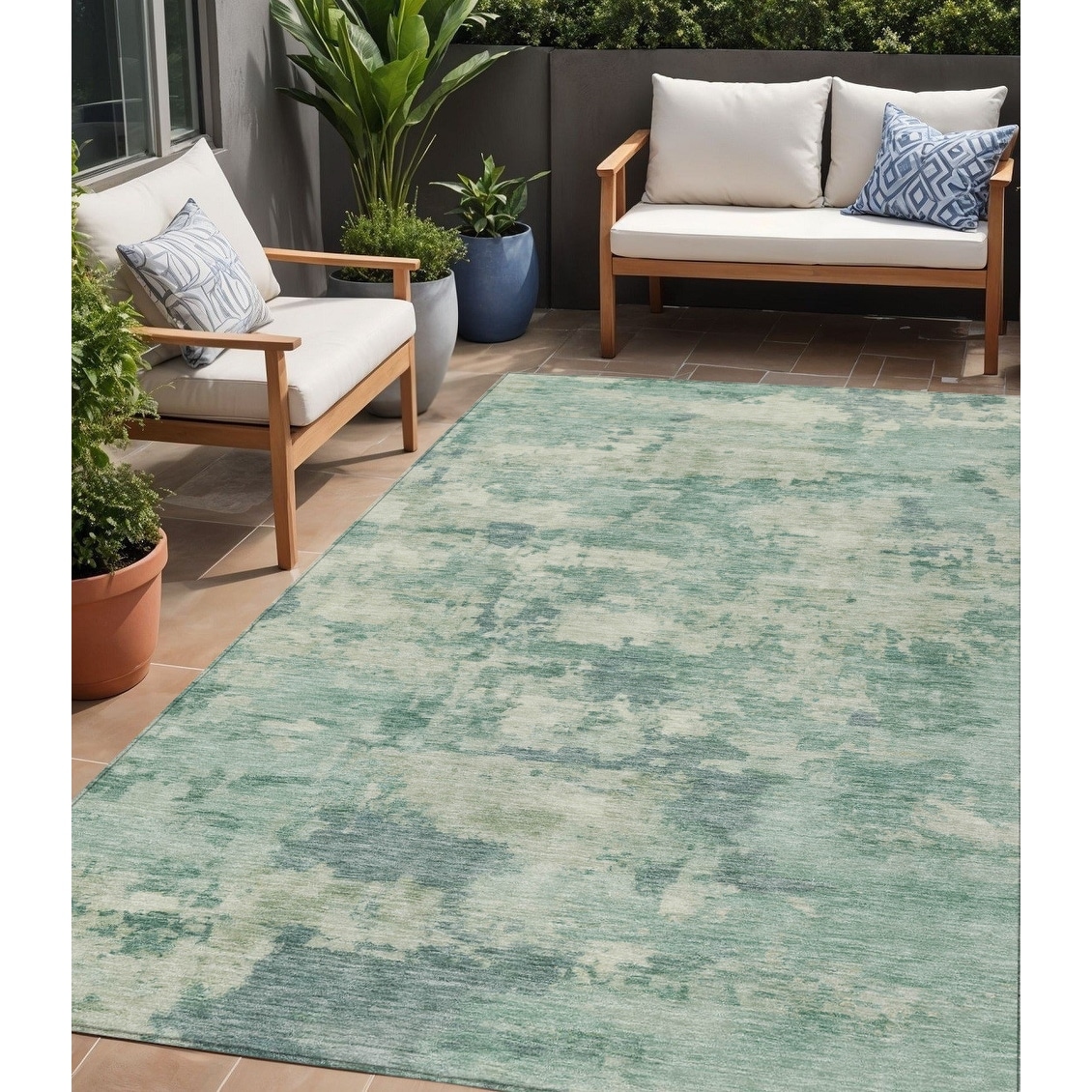 5' X 8' Teal Blue Linen And Pale Aqua Abstract Washable Indoor Outdoor Area Rug - 5' x 8'