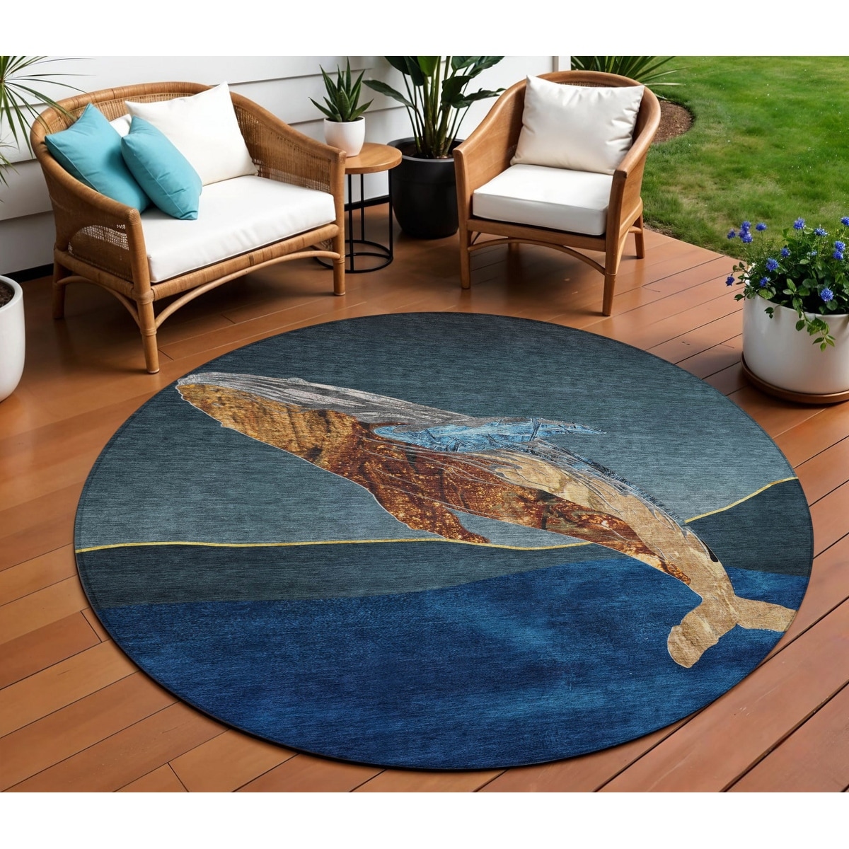 8' Blue And Brown Round Animal Print Washable Indoor Outdoor Area Rug - 6' x 9'