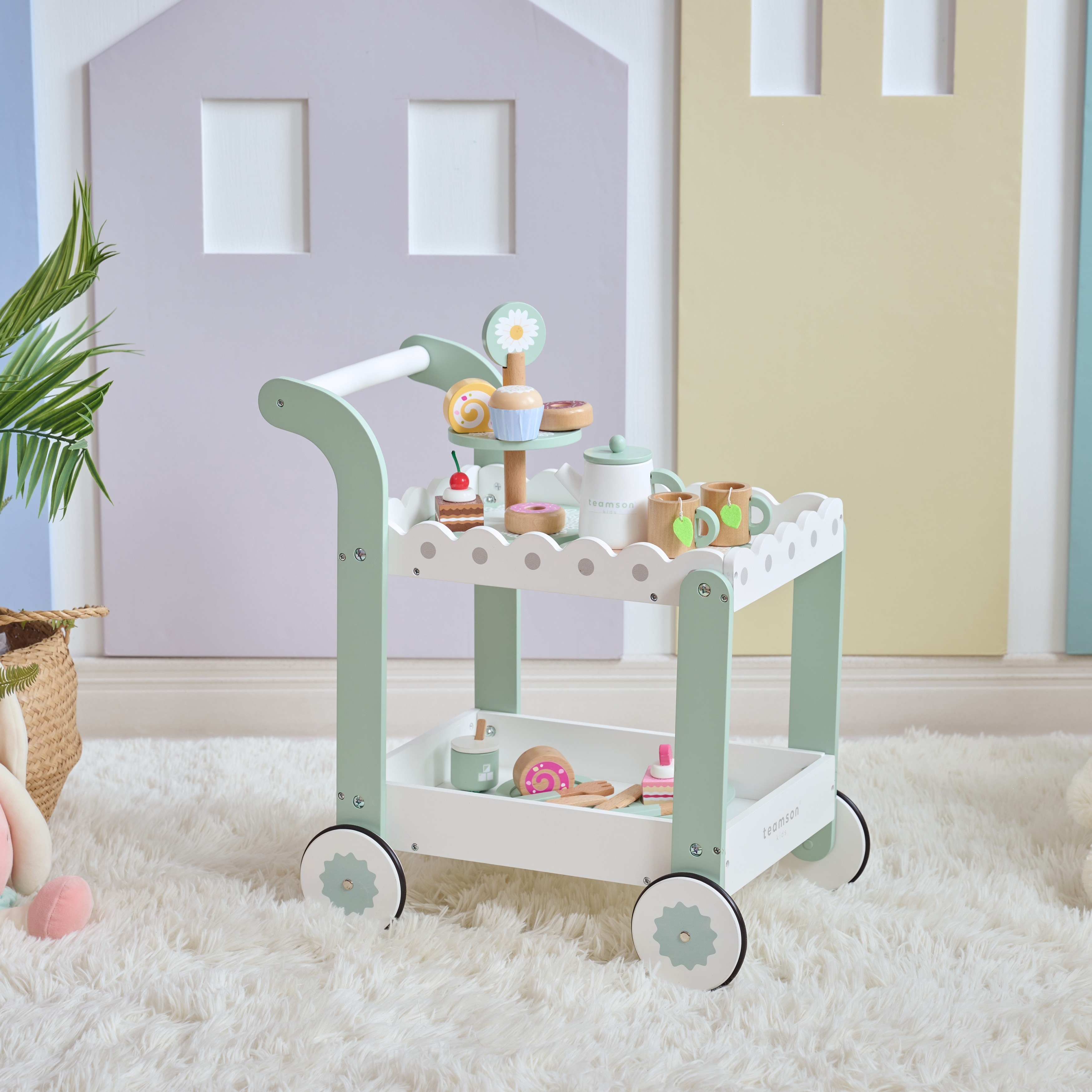Teamson Kids Wooden Afternoon Sip Dessert Toy Cart Pretend Play with 24 Play Food Pieces for Age 3-5 Toddlers and Kid - Mint