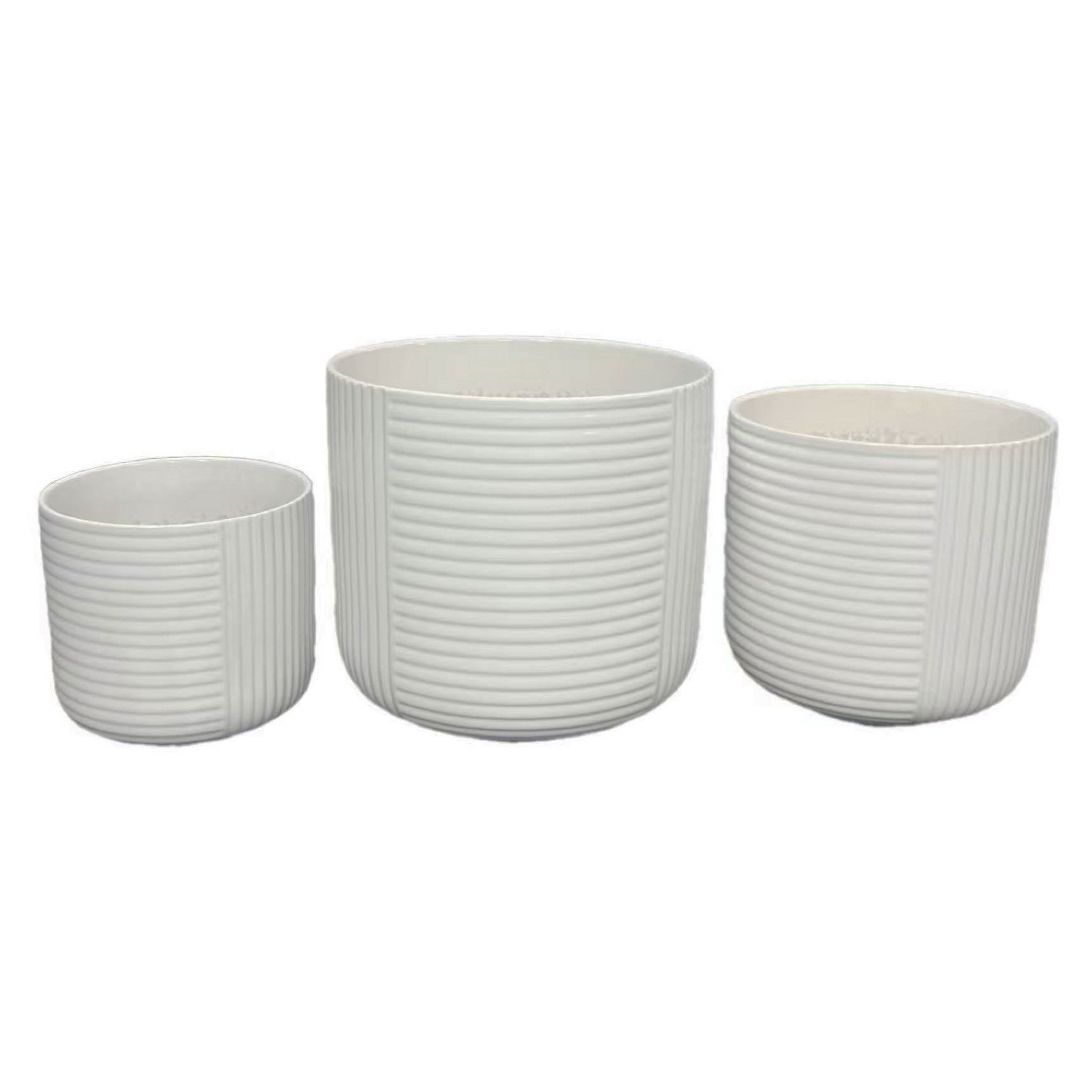 Set of 3 Ceramic Planter, Ribbed, Geometric Design, Matte White Finish