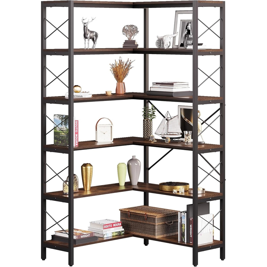L-Shaped 6-Tier Corner Bookshelf with Adjustable Feet, Industrial Style Metal Frame for Home Office Storage