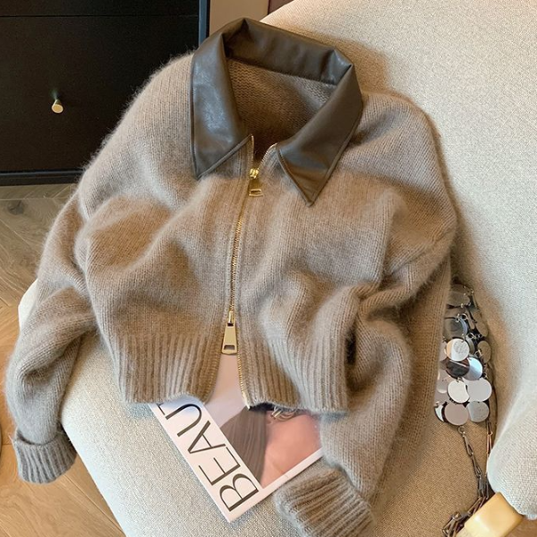 Vintage Zipper Cropped Cardigan For Women Thick Knitted Autumn Sweater Bomber Jacket Fitted Knitwear Coat coffee xs