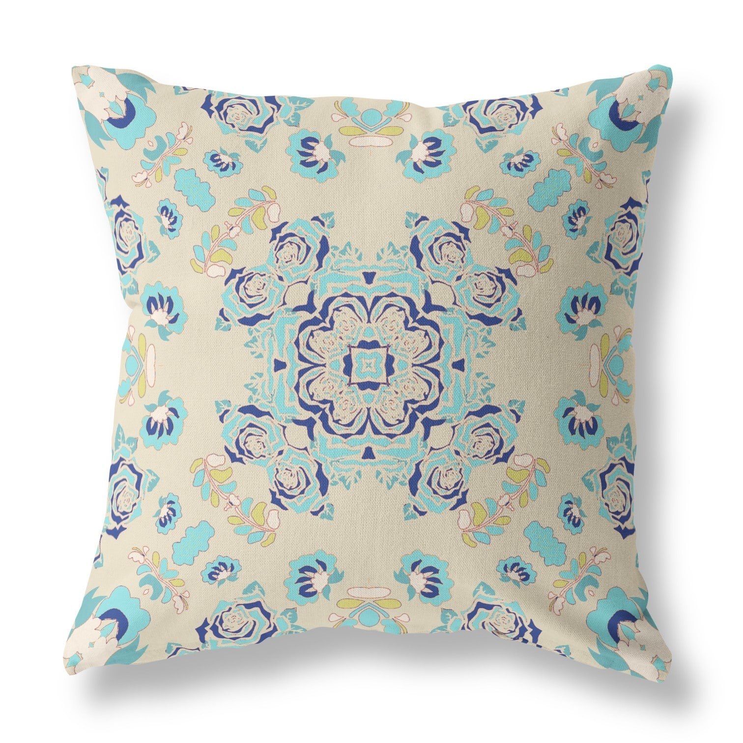 26" X 26" Off White And Light Blue Broadcloth Floral Throw Pillow