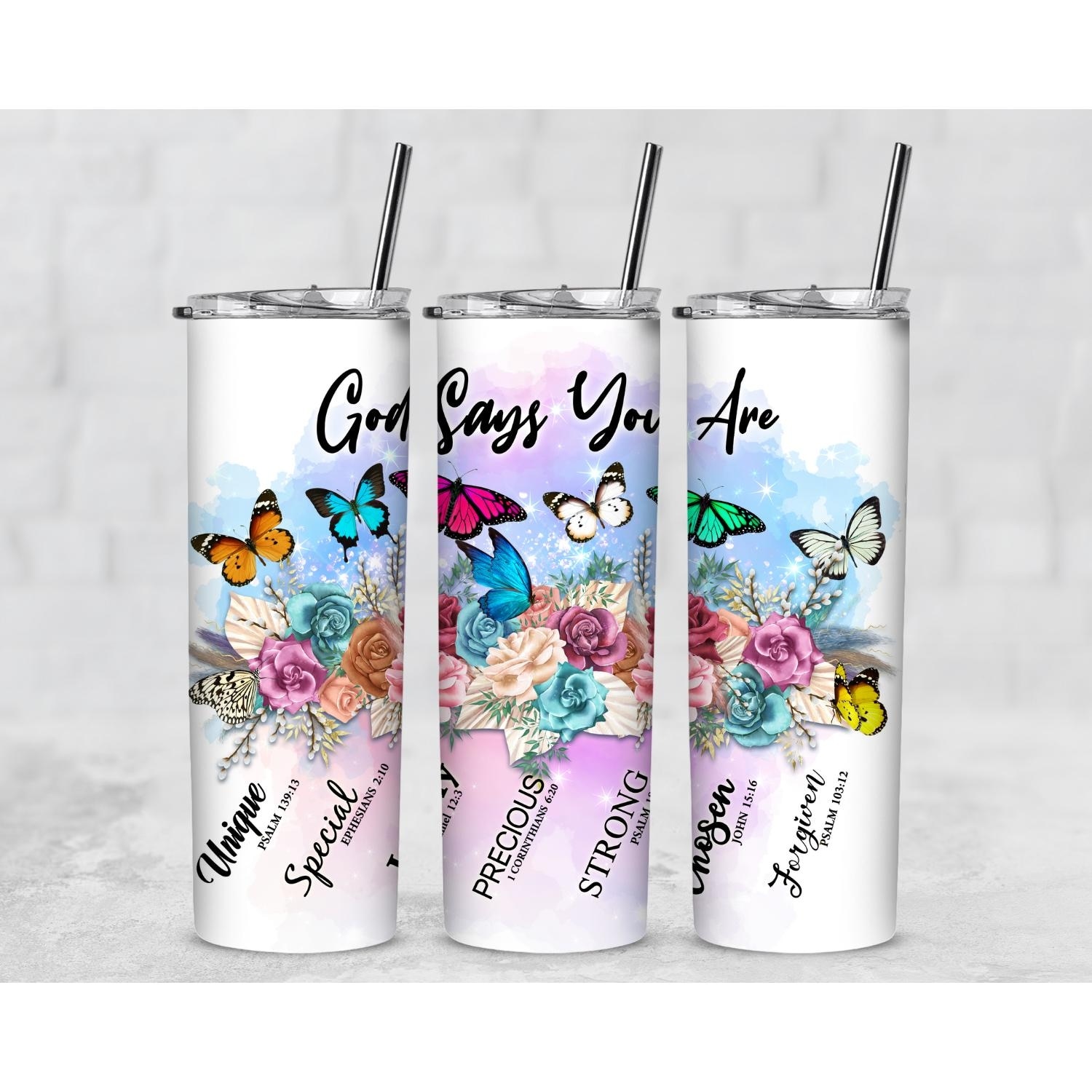 God Says You Are Butterfly Boho Christian 20 Oz Metal Tumbler w/Lid and Straw - Multi