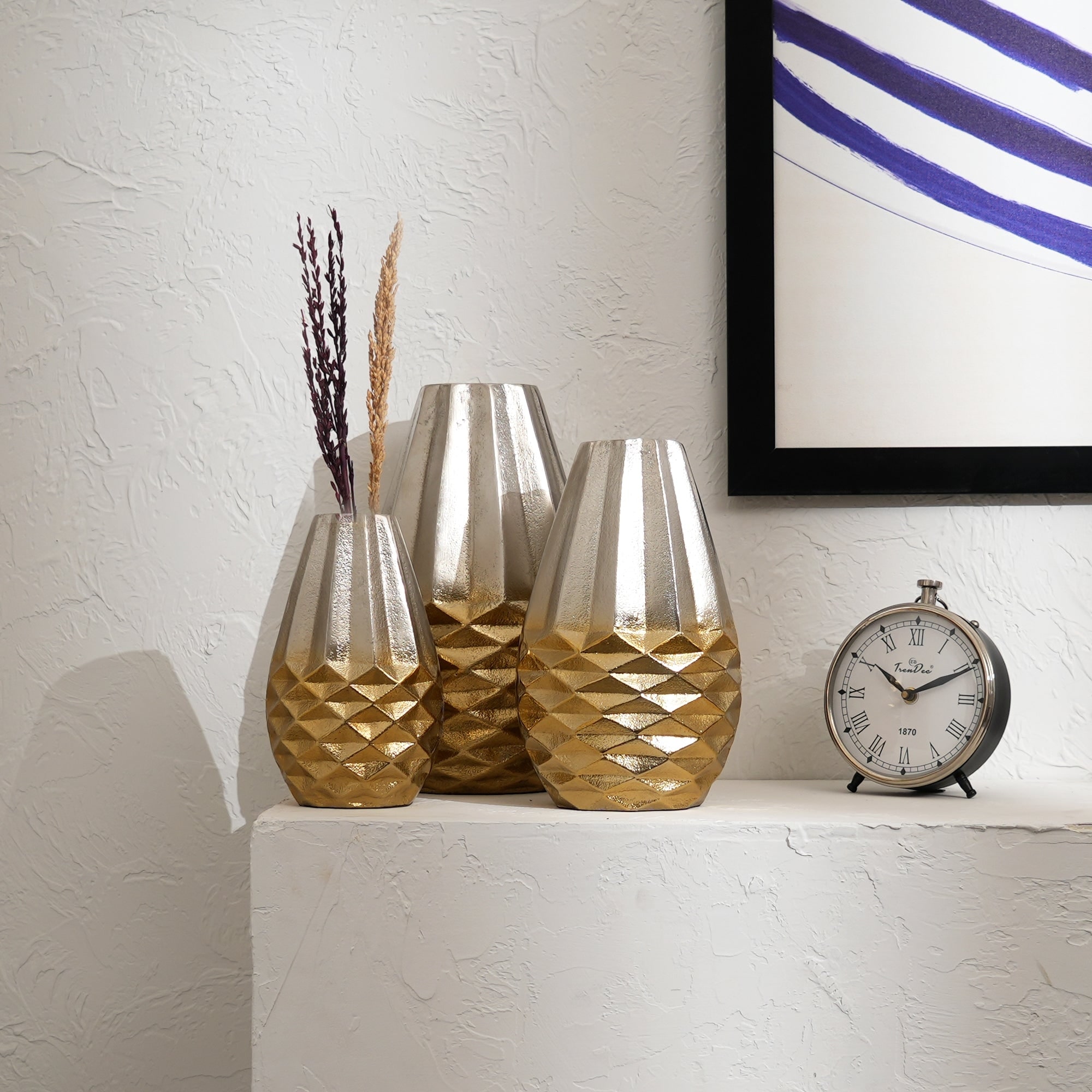 Set of 3 Golden Beehive Design Aluminum Vases - Gold & Nickel Finish Table Accents