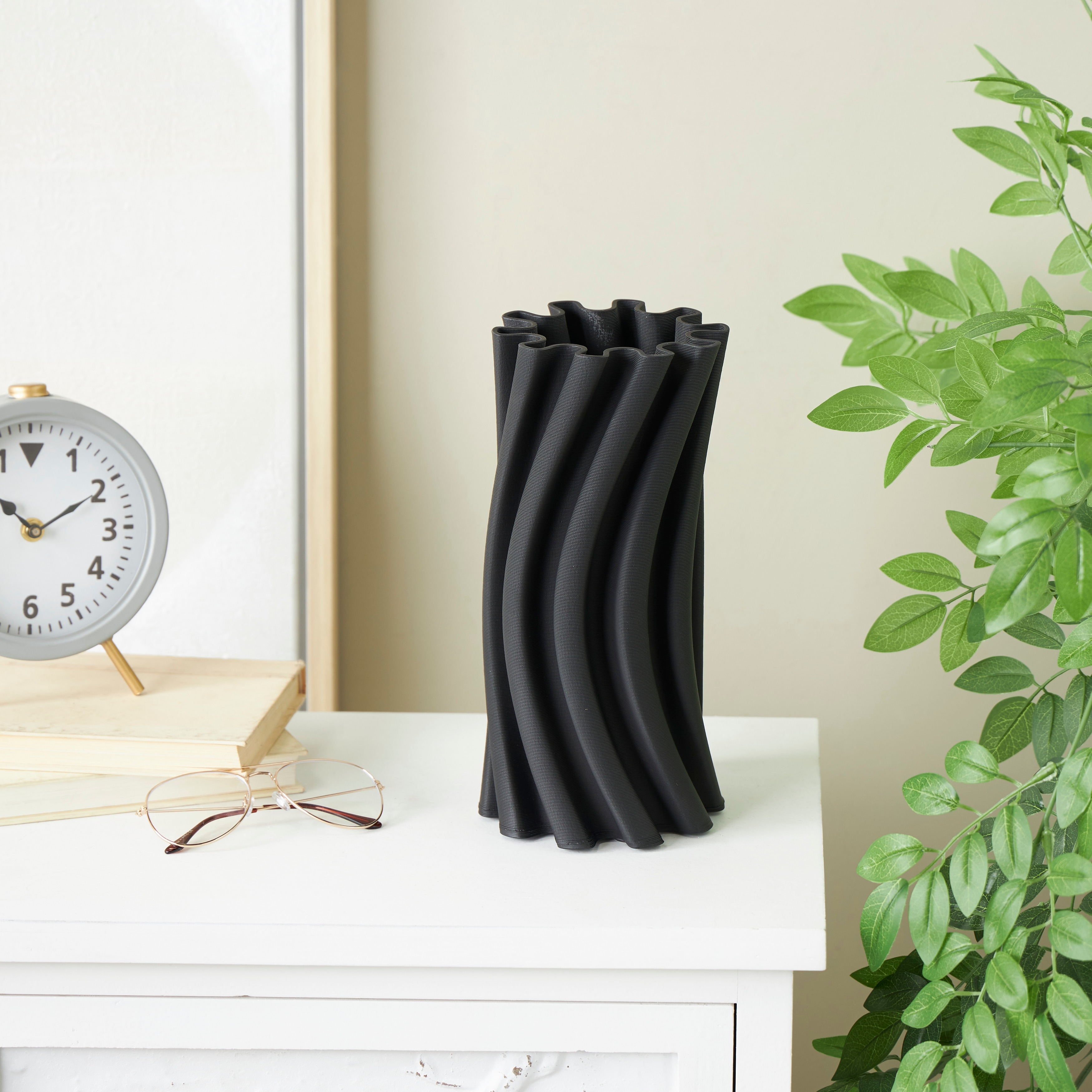 Black Ceramic Curvy Ribbed Abstract Vase with Floral Shaped Rim