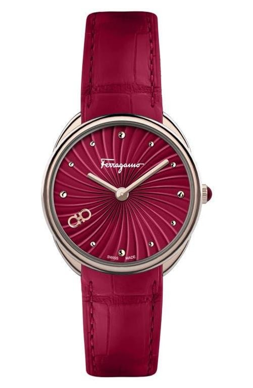 Guilloché Dial Embossed Leather Strap Watch - Red - Ferragamo Watches