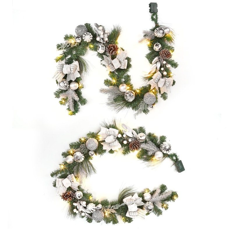 6 ft Prelit Christmas Garland for Mantle, Xmas Holiday Garlands with LED, Silver Bows & Pine Cones, Indoor