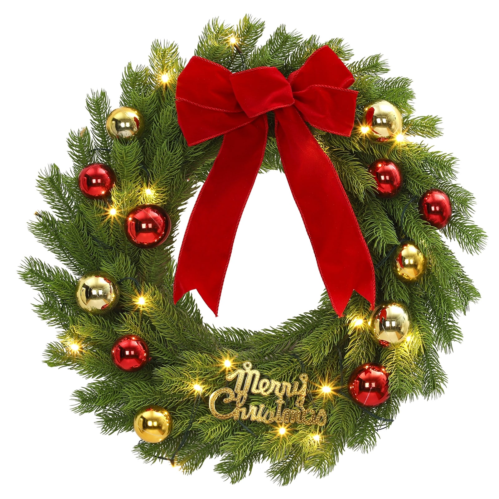 24 Inch Christmas Wreath with Red Bow & Balls, 20 LED Lights